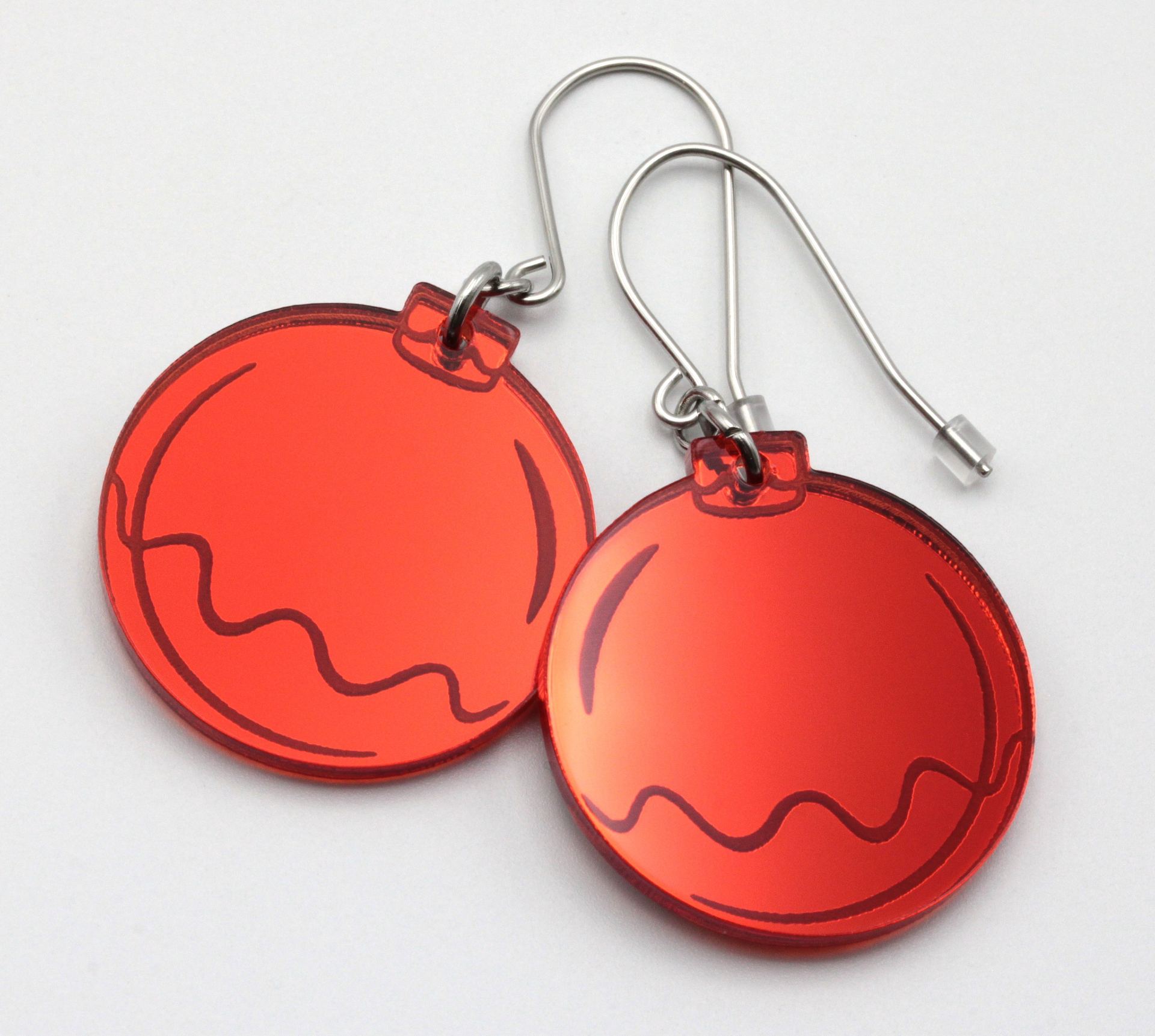 Ihanat joulupallo-korvakorut laserleikatusta peiliakryylistä ja teräsosista.