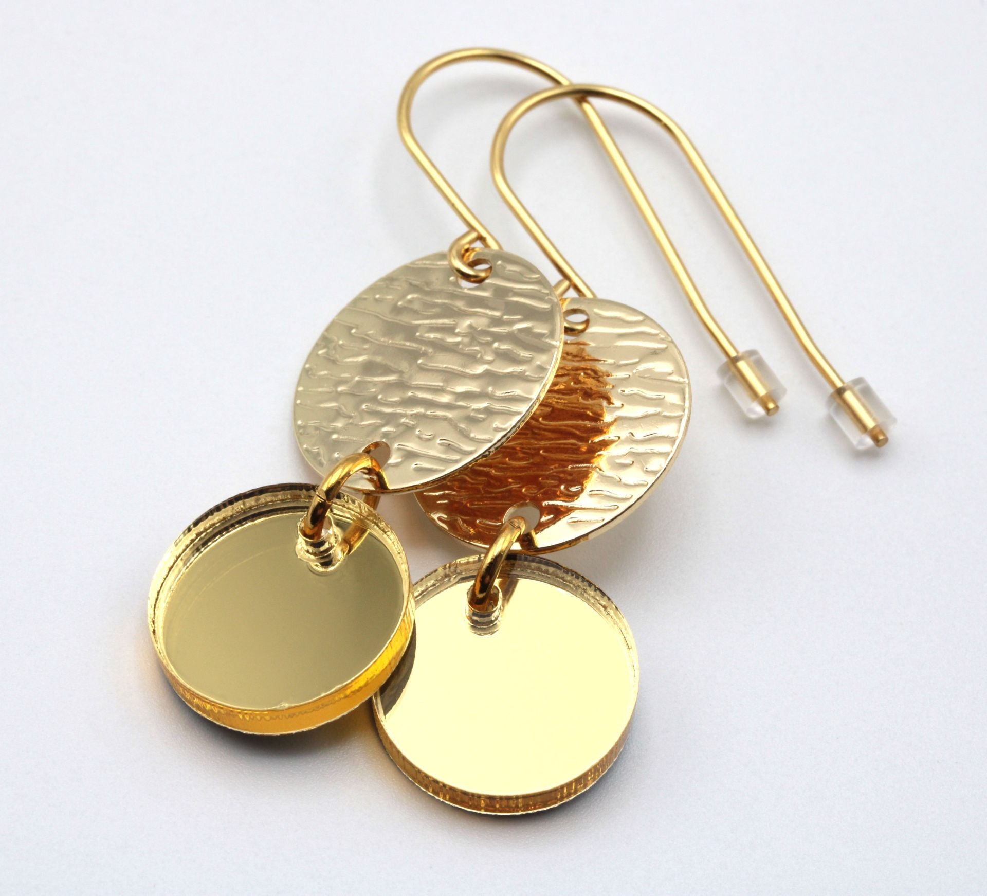 Elegantin kauniit korvakorut laserleikatusta peiliakryylistä, korumetallista ja teräksestä.