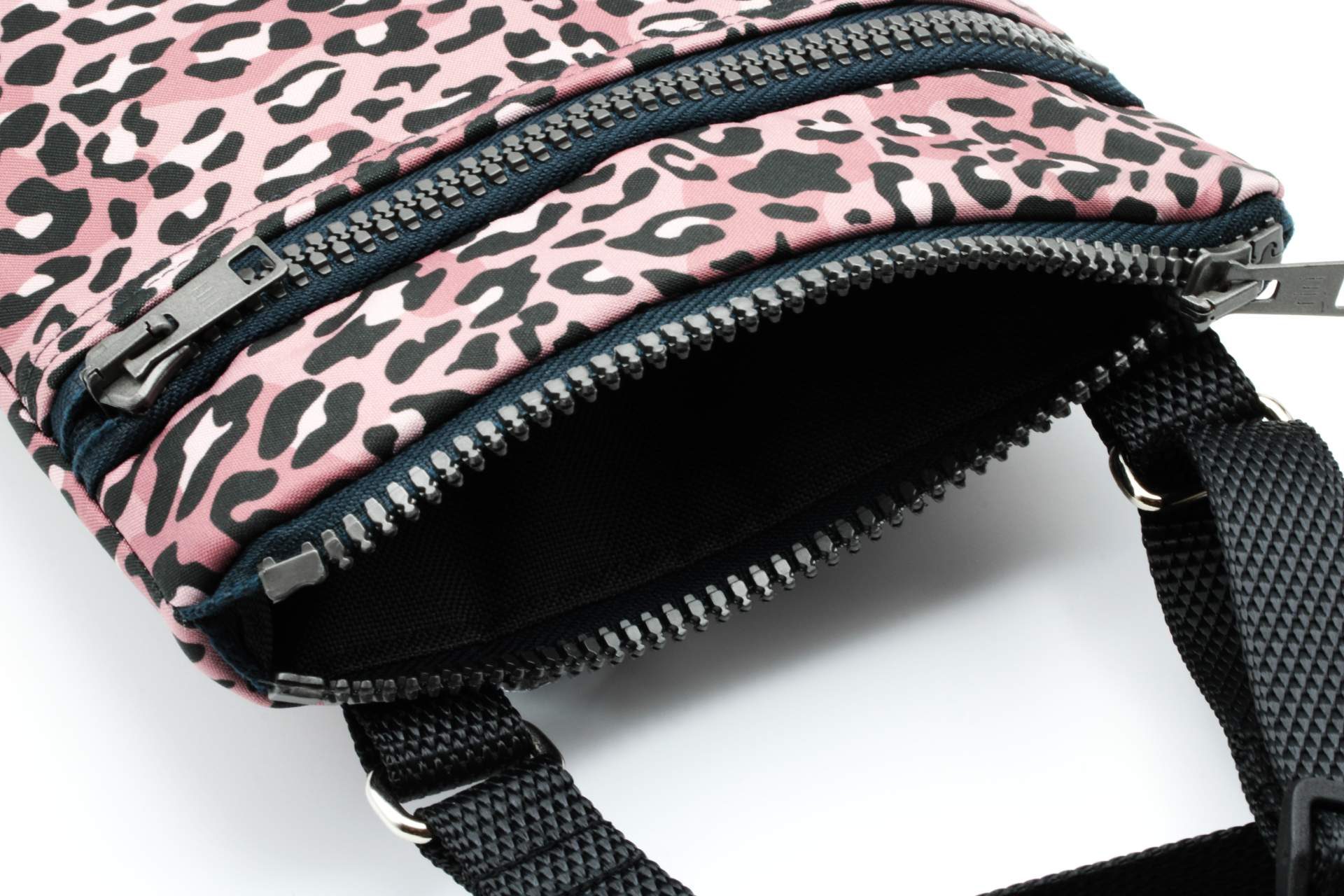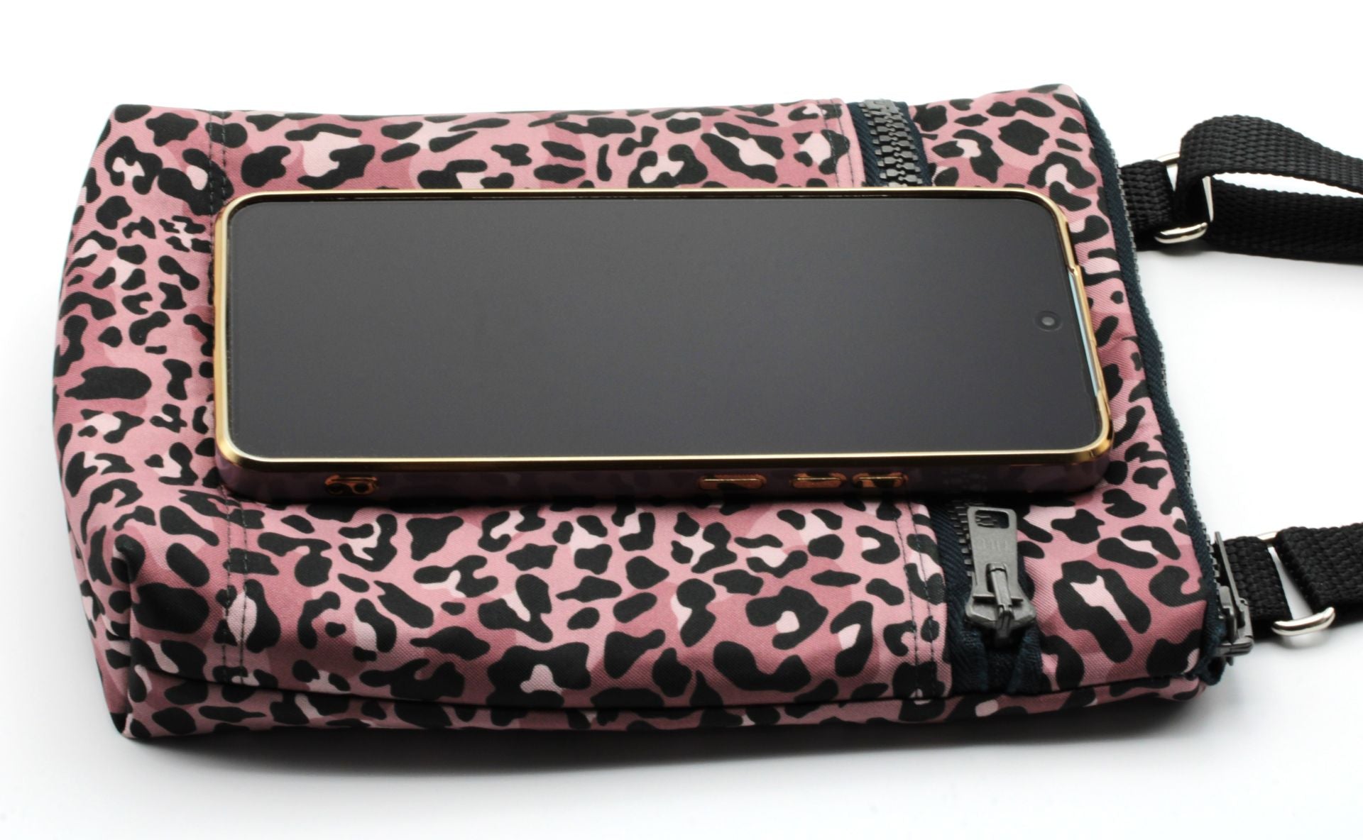 Kännykkälaukun kangas leopardikuvioista softshelliä (Suomesta). Vuorikangas pinnoitettua polyesteriä.