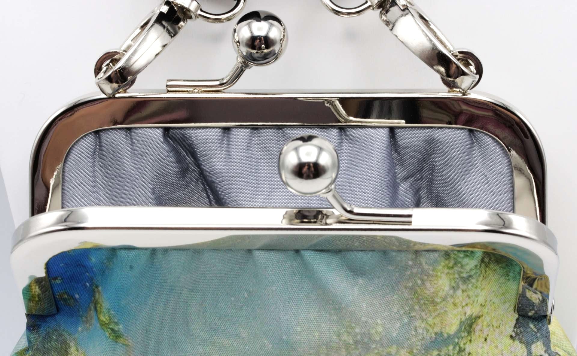 Kukkarokehyksen leveys 12 cm. Laukun kokonaismitta noin 15 x 23 cm.