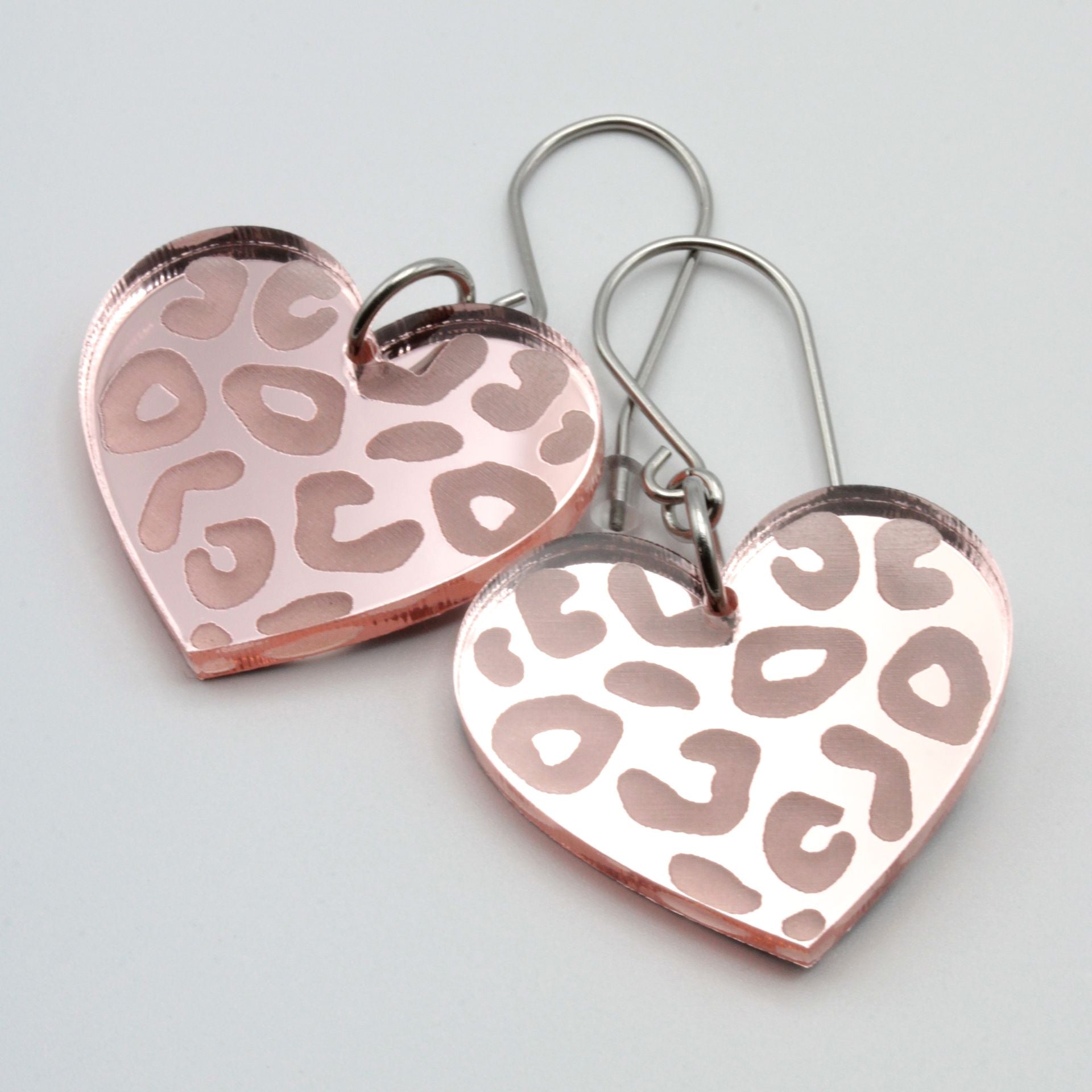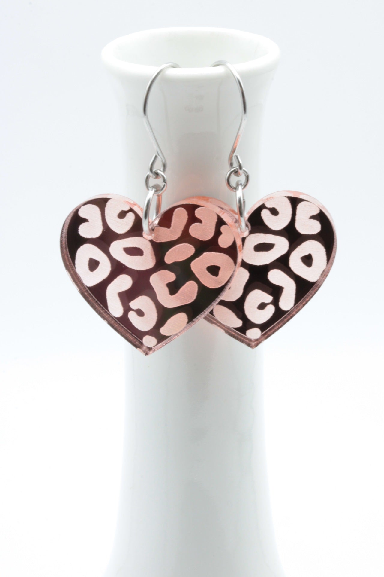 Ihanat leopardikorvikset laserleikatusta peiliakryylistä ja teräsosista.
