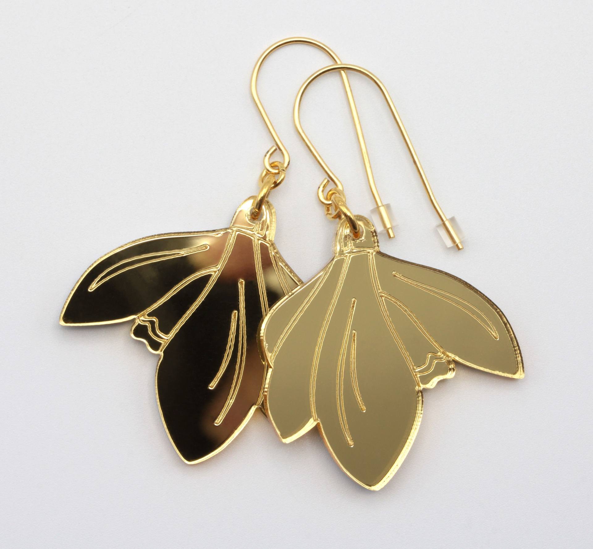 Ihanat lumikello-korvikset laserleikatusta peiliakryylistä ja teräsosista.